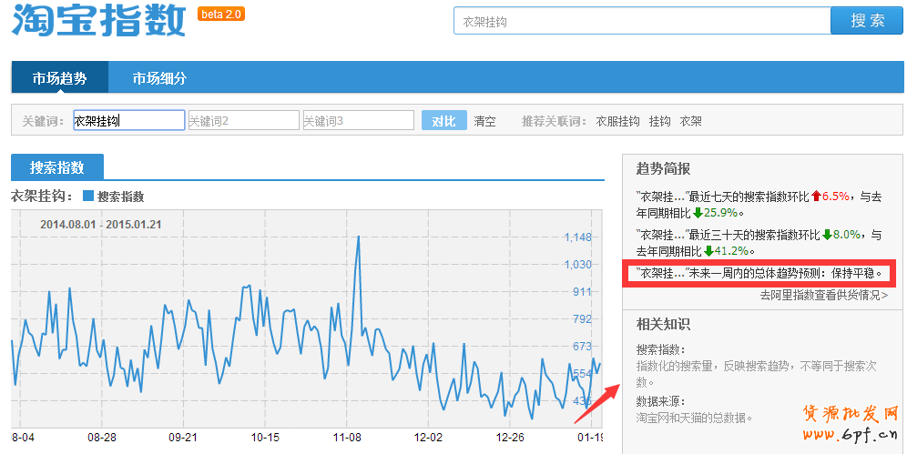 從以上圖片——淘寶指數(shù)“衣架掛鉤”關(guān)鍵詞趨勢中可看出,從11月份開始該關(guān)鍵詞從斷出現(xiàn)下滑的趨勢,但近期有回升的趨勢。