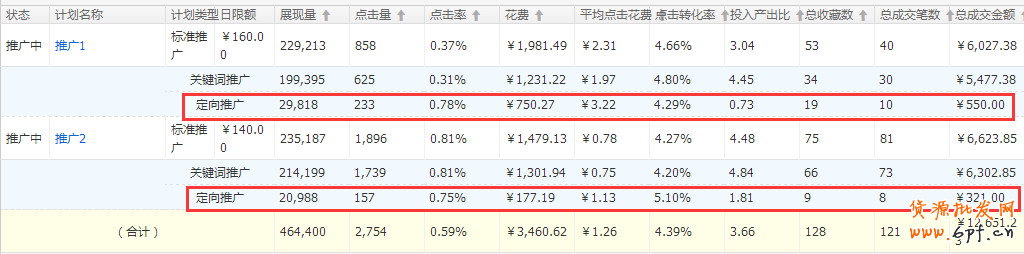 分詞從上表可看出:(計(jì)劃:“推廣1”要比“推廣2”點(diǎn)擊率低于2倍)“推廣1”計(jì)劃點(diǎn)擊率為0.37%,“推廣2”點(diǎn)擊率為“0.81%”,看到這里,大家肯定都會覺得“推廣1”計(jì)劃就是我們要抓的“目標(biāo)”,但是大家有沒有注意到,兩個(gè)計(jì)劃“定向推廣”的點(diǎn)擊率數(shù)據(jù)計(jì)劃“推廣1”中的點(diǎn)擊率表現(xiàn)是最好的(圖中紅色方框內(nèi)),所以下面可以將“推廣2”中的定向推廣力度進(jìn)行降低控制,當(dāng)然我們的“推廣1”計(jì)劃也不能忽略,這里要提醒大家:在進(jìn)行排查的時(shí)候,不要單單只看計(jì)劃整體的點(diǎn)擊率,也要細(xì)分到內(nèi)部數(shù)據(jù),如下圖: