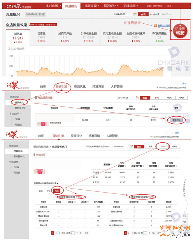 江湖策,新版可以在:渠道引流->渠道優化->搜索優化->立即優化->無線,查看相應寶貝的無線引流和成交關鍵詞。
