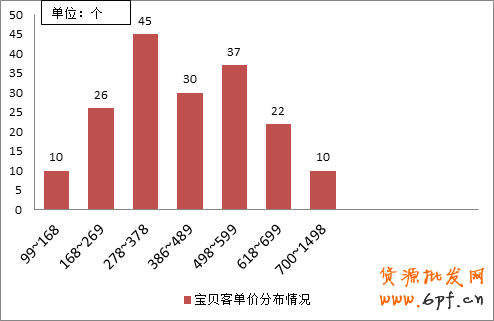 可以重點(diǎn)分析寶貝客單價(jià)格分布,集中在主流價(jià)格278~599元的寶貝有112個(gè),其中386~489元的有30個(gè),相較其余兩個(gè)價(jià)格區(qū)間的寶貝略少一些??梢灾攸c(diǎn)分析這三個(gè)價(jià)格區(qū)間的寶貝類型和品牌風(fēng)格。從而得出這三個(gè)價(jià)格區(qū)間銷量差別由什么因素造成,同時(shí)對(duì)比自身產(chǎn)品。賣家若想知道自身最好能做到什么業(yè)績(jī),也就是該價(jià)位的“天花板”,亦可通過分析處于同一價(jià)格段的競(jìng)品,觀察其月銷量即可。