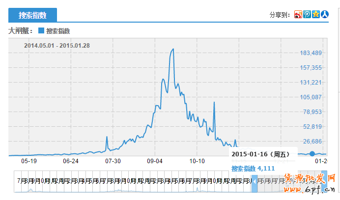 可以看出2014年5月-2015年1月,香辣蟹的峰值只有286。因為季節(jié)的問題,天氣太冷或是雨雪氣候,生鮮大閘蟹配送要么時效達不到,要么會凍死,所以很難進行物流運輸。那么這個時候市場上大閘蟹的寶貝數(shù)會將會大大減少,而且很多地方不能發(fā)貨,這個時候香辣蟹就有效彌補了市場短缺,于是我們將香辣蟹的關鍵詞改為大閘蟹,如下圖: