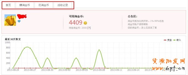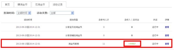 這里您看到自己花費了賺多少淘金幣和花費多少淘金幣,