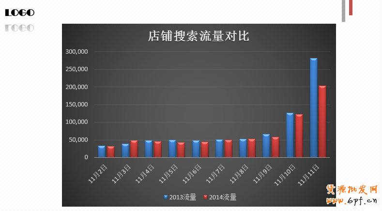1.4 ****嗖嗖嗖嗖, 14與13年行業(yè)整體流量下滑達(dá)到40-50%,而14年店鋪流量能與13年搜索流量穩(wěn)穩(wěn)達(dá)平的情況,雙11當(dāng)天由于好多貨品賣光下架了(流量有所下架)