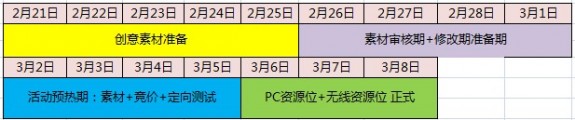 i:小二給大家做一個(gè)時(shí)間軸的安排大家可以參考參考一般活動(dòng)提前2周做好規(guī)劃,素材 審核 競(jìng)價(jià) 定向 正式投放