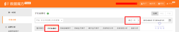 任何一間店鋪都要必須配合外部大環(huán)境的趨勢發(fā)展而順勢而為才能大展拳腳,如果不能適從,那么店鋪經營就會遇到銷售瓶頸。因此,店主想要找到屬于店鋪的熱銷款,首先要從客觀的數據了解行業(yè)發(fā)展和趨勢。數據魔方的行業(yè)分析中,可以查看各個子行業(yè)銷售排行在最近一年,三個月,30天,7天的的數據變化,總結出過去一年,三個月,30天,7天的行業(yè)大環(huán)境發(fā)展,并評估未來的趨勢。首先,我們打開數據魔方,在行業(yè)分析中,打開子行業(yè)排行,并選取最近一年為時間維度,查看最近一年整體銷售數據。