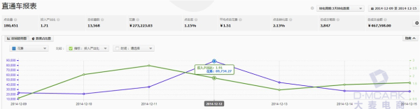 從上圖可以看出,該店鋪淘寶/天貓直通車當天轉化投產比為1.06,點擊率1.23%,PPC為1.51;三天轉化投產比為1.71,點擊率1.15%,PPC1.51元