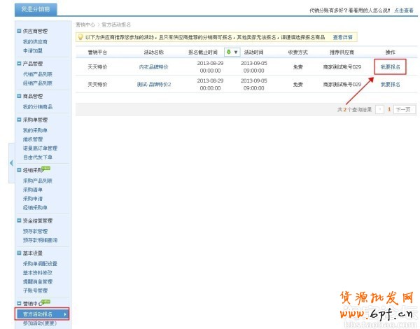 供銷后臺會出現《營銷中心》的菜單項及《官方活動報名》和《組織活動(麥麥)》兩個子菜單,親需進入《官方活動報名》,即可看到天天特價報名入口。選擇自己想要參加的活動,點擊按鈕“挑選分銷商”,即可挑選分銷商報名本次活動。