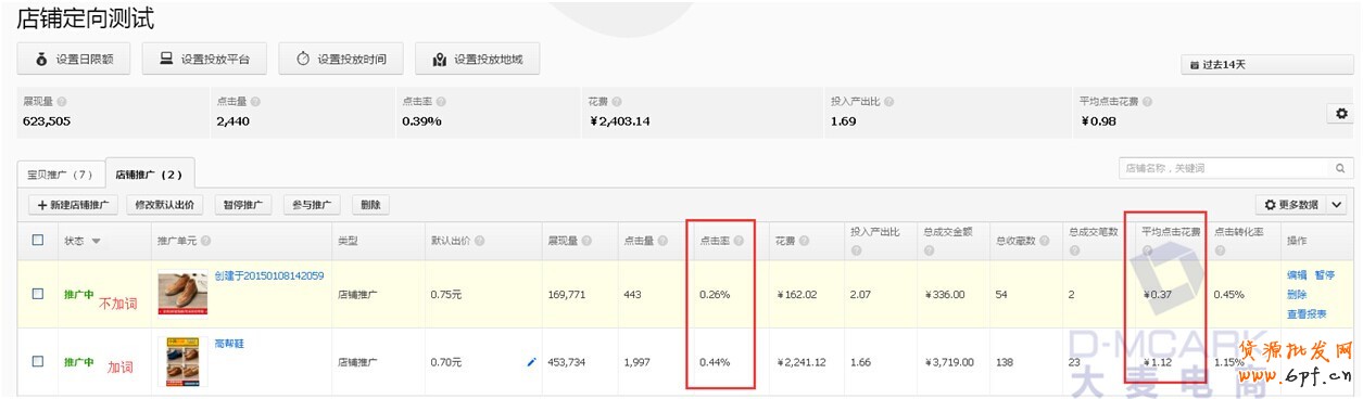 以上例子是一家男鞋店,加詞并且打開定向的店鋪推廣計劃的點擊率遠遠比不加詞并且打開定向的計劃要高很多,主要是關鍵詞的點擊率比較高,但是就轉化效果和PPC來說,不加詞的推廣計劃的轉化效果會更好,而且PPC更低。