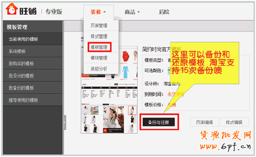 第一步:進入店鋪裝修后臺——點擊左上角“裝修”選項——選擇“模板管理”——點擊“備份與還原”。