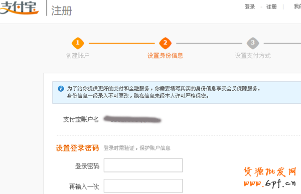 4)激活完成,就會進入以下頁面,設置身份信息,設置登錄密碼,填寫好登錄密碼后,接著設置支付密碼,支付密碼最好設置一些長一點,難度高一點的密碼,這里的支付密碼不能和登錄密碼相同的,最后輸入身份證號碼和姓名,填寫好點擊“確定”(如下圖)