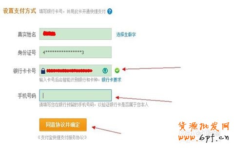 5)接著就要設置支付方式,填寫真實姓名、身份證號、銀行卡號,這里輸入的銀行卡是需要開通了網銀的銀行卡,網銀可以到銀行柜臺開通,最后填寫手機號碼,點擊“同意協(xié)議并確定”(如下圖)