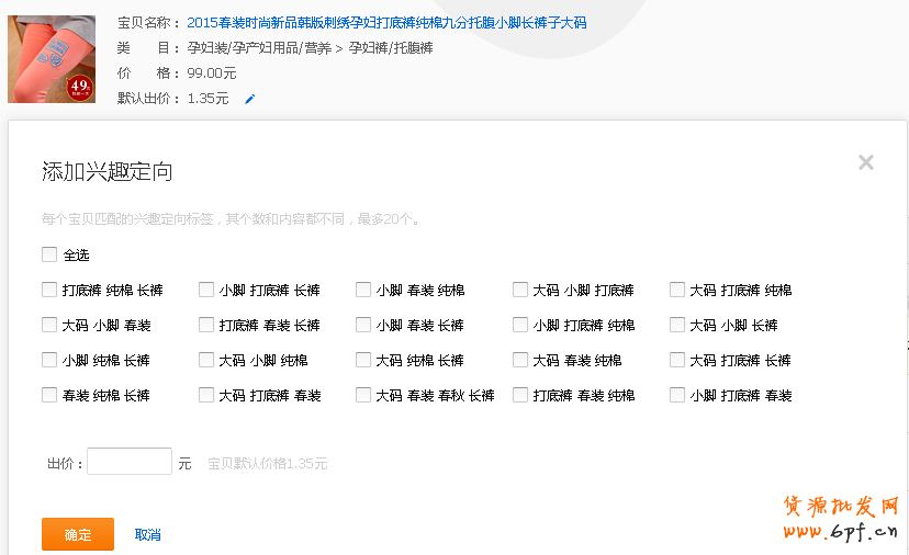 而興趣定向則是根據(jù)關(guān)鍵詞來(lái)精準(zhǔn)顧客,興趣定向的每個(gè)標(biāo)簽都代表著不同的流量人群,系統(tǒng)則會(huì)根據(jù)寶貝的標(biāo)題推薦出1~20個(gè)興趣標(biāo)簽,也即是1~20個(gè)關(guān)鍵詞,不同的關(guān)鍵詞代表著不同的流量人群,類似于鉆展的興趣點(diǎn)定向。