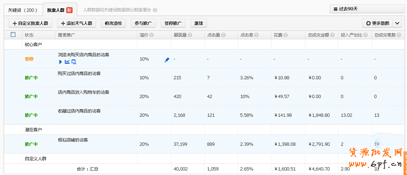 直通車新增加的搜索人群功能,其本質(zhì)是在于買(mǎi)家搜索關(guān)鍵詞的時(shí)候,加入溢價(jià)權(quán)重,對(duì)適合對(duì)應(yīng)的買(mǎi)家,可以針對(duì)性的提高溢價(jià)。讓這類人群在更靠前的直通車位置看到,搜索人群是在直通車搜索上對(duì)不同的細(xì)分人群溢價(jià),主要分為:核心客戶、潛在客戶、自定義人群。其本質(zhì)都是通過(guò)搜索關(guān)鍵詞,針對(duì)不同的人群進(jìn)行溢價(jià)的,使得賣(mài)家能夠在更加精準(zhǔn)的人群中獲得更多的展現(xiàn)。