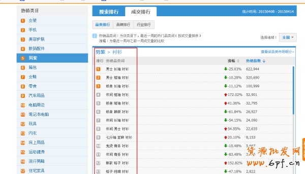 在這里可以看到男裝子類目的一些銷量排行,把鼠標放在你需要看的子類目上面,不要點擊,例如我要看襯衫,就會出現如圖:
