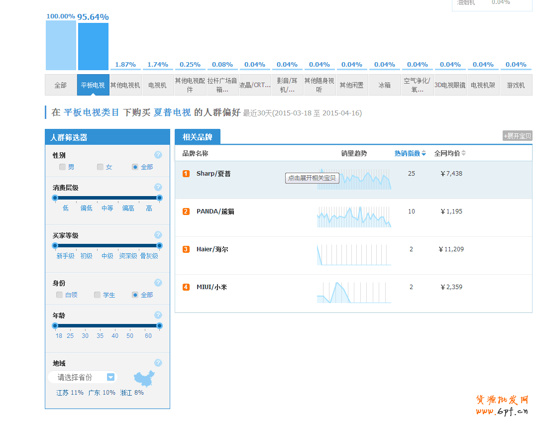 同樣的,搜索某一個關鍵詞的消費群體,在一定的數據量下,也會表現出一些共同的行為特征,我們通過淘寶指數可以看到,搜索“夏普電視”這個關鍵詞的群體,也是男性居多,消費能力強,中年人居多,那么搜索這個關鍵詞的客戶,對我們來說,就是非常精確的消費群體了,做ROI計劃是非常好的選擇。