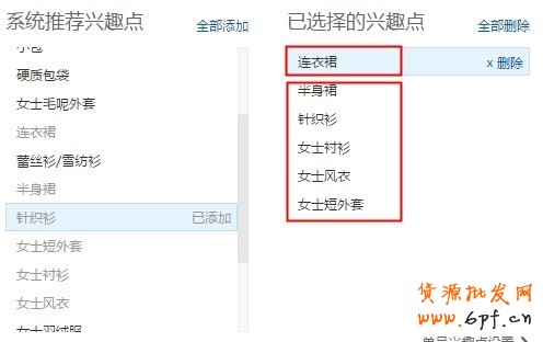 測試時,先用店鋪主推產(chǎn)品的興趣點去測試,根據(jù)獲取的流量、ctr和cpc,再適當放寬至相關的興趣點。例如推廣連衣裙時,可先選擇”連衣裙“,根據(jù)投放的數(shù)據(jù),再看是否增加相關興趣點。