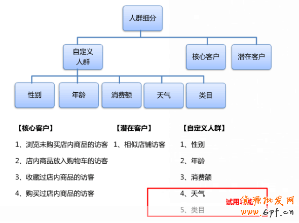 從以上的圖表中不難看出,核心客戶、潛在客戶、自定義人群是并列關系,自定義人群性別、年齡、月消費額以及天氣和垂直類目是組合關系
