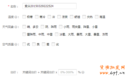 天氣標簽分為:溫度、天氣氣象、空氣質(zhì)量,不同的類目可能使用的情況也會不同,像雨具的賣家,天氣標簽的設(shè)置的作用是很好的,還有服裝類目在做預熱的時候,也是可以用到這個天氣標簽,空氣質(zhì)量這一塊可以不用去做選擇,第一這個標簽的影響不是很大,第二避免縮小圈定的人群。