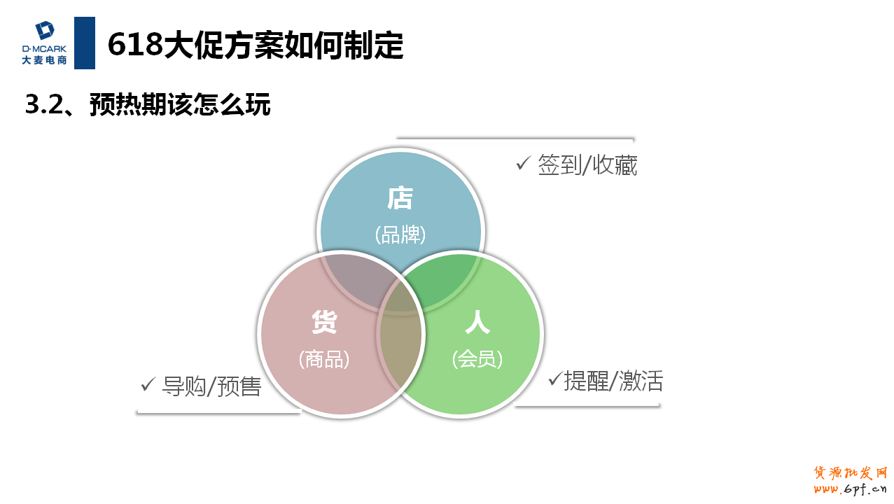 預熱期間營銷目標: 店鋪要常進:持續進行連貫性的主題營銷,引導消費者重復訪問,增加大促期間的自主訪問購買人群;產品要鎖定:購物清單制定、人氣爆款提前加入購物車、大促專供款預定等等,以產品鎖定更多潛在消費者;會員要提醒:店鋪長期的新老會員都要在本時期進行再次喚醒,提醒會員特權和優惠,針對不同級別的會員選擇到達率不同的用戶關懷方式和提醒頻率。
