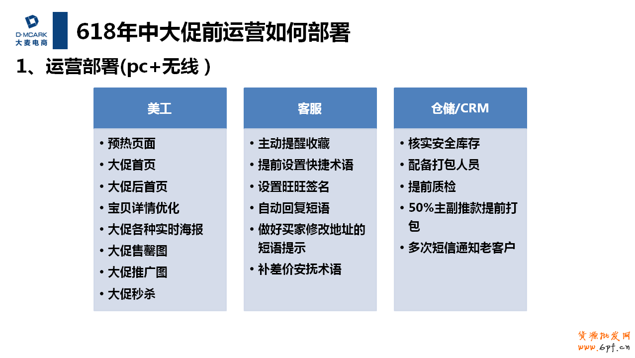 結合前面的各個時期的營銷玩法,落實到各個崗位分工,包括的維度有:具體時間節點、具體的人員需要執行的具體內容。例如美工要做預熱頁面、大促首頁、大促后首頁、寶貝詳情頁優化、大促各種試試海報、大促售罄圖、大促推廣圖、大促秒殺等; 客服方面就要做好主動提醒收藏、提前設置快捷術語、設置旺旺簽名、自動回復短語、補差價安撫術語等等; 倉儲方面需要核實安全庫存、配備打包人員、提前質檢、50%的主副推款提前打包、多次短信通知老客戶等;