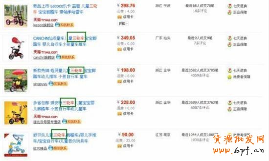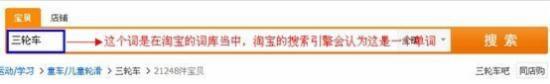 對于這種形式的關(guān)鍵詞,淘寶會認(rèn)為他是一個詞,在展示搜索結(jié)果時(shí),這個詞不管幾個字,必須完全連在一起并出現(xiàn)在標(biāo)題中的寶貝才有被展示的機(jī)會。不連在一起的不能被提取出來,比如我們在淘寶的搜索框里面搜索“三輪車”這個關(guān)鍵詞: