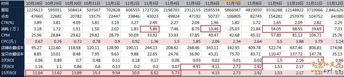 可以看出,從CTR上看,越早預熱點擊率越高,CPC越低,寶貝收藏成本越低,從15天ROI來看越高。預算大頭分配在雙11前3天,而不是在雙11當天。預熱的重要性不言而喻。
