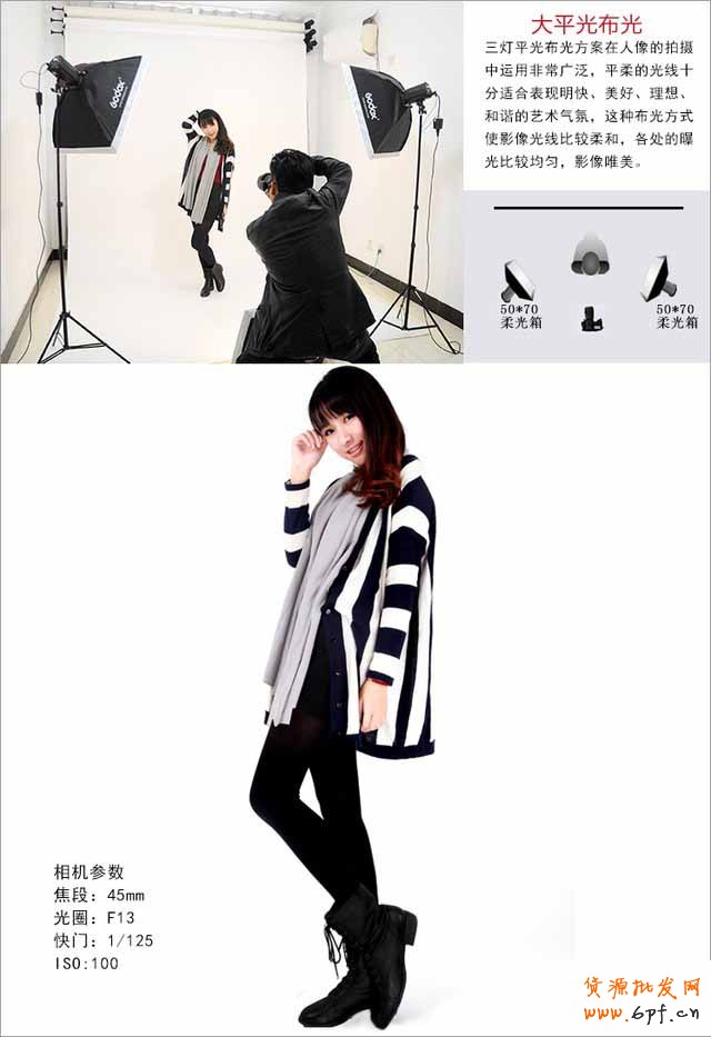 大平光布光在人像的拍攝中經常會使用到,這種布光方式使影像光線比較柔和,各處的曝光比較均勻,影像唯美。