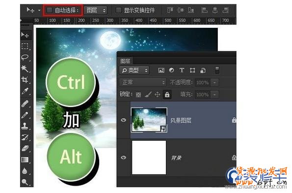 如果在移動工具選項欄沒有勾選自動選擇的話,需要按住Ctrl + Alt 點擊圖層才能選中鎖定的風景圖層。