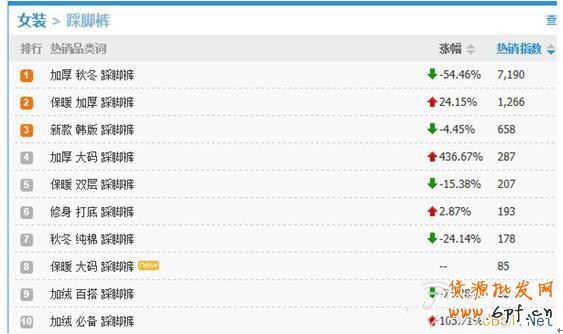 當(dāng)我們回到“成交排行”的頁面,鼠標(biāo)點擊“踩腳褲”時,就可以看到這些詞的核心關(guān)鍵詞只有一個,那就是“踩腳褲”。在我們優(yōu)化寶貝標(biāo)題的時候,核心詞有且應(yīng)該只有一個,然后圍繞著這個核心詞再來擴(kuò)充長尾詞。當(dāng)然在優(yōu)化寶貝標(biāo)題時,最好選擇搜索量大,轉(zhuǎn)化率高,寶貝數(shù)量少的熱搜詞,我們習(xí)慣叫做黃金長尾關(guān)鍵詞。