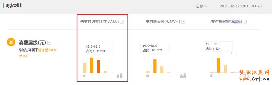 從上面你的數(shù)據(jù)看來,未支付的訪客當中,消費層級在19-32元的占37.79%,32-88元的占32.29%,這兩個區(qū)間的百分比相當,可見優(yōu)惠券的設(shè)置要針對消費層級在32-88元人群進行設(shè)置,促進轉(zhuǎn)化。這部分的訪客,可能是由于店鋪的頁面不夠美觀,優(yōu)惠力度不夠吸引,或沒有找到合適檔次(32-88元)的產(chǎn)品,因此我們一方面可以考慮針對這個消費層級主推幾款高質(zhì)產(chǎn)品,另一方面也可以考慮在這個額度設(shè)置一個優(yōu)惠券的門檻,促使這部分訪客對這幾款產(chǎn)品的購買轉(zhuǎn)化。