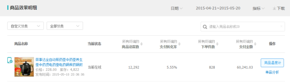 從表上可以看出,活動第一天單品的訪客在3550,銷售額是在20142元。通過這次活動,我們首先積累了大量的銷量,另外就是更加深入的了解了煎藥壺這個產品的購買人群。還有通過這一次活動,這款單品的排名得到了提升。