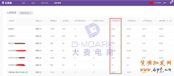 該店鋪是一家經營普洱茶的天貓店,日均營業額在3000-5000元左右,店鋪基礎一般,鉆石展位每日消耗在500元上波動。5月中旬店鋪有一款產品報上了一期淘搶購活動,需要加大鉆石展位投放,預算在2000元左右,鉆石展位專員結合之前投放效果比較好的訪客定向進行測試,發現人群跟不上消耗,容易出現通投流量,那么該如何加大精準人群呢?這時達摩盤剛好開通不久,鉆石展位操作員就使用達摩盤進行標簽組合,圈定不同的精準人群進行測試投放?;顒舆^后,鉆石展位操作員做了下數據統計整理,發現效果表現顯著,如下圖: