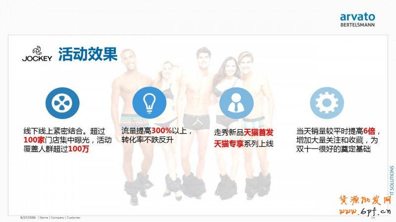 以Jockey品牌為例。Jockey是一個(gè)來(lái)自美國(guó)的內(nèi)衣品牌,在美國(guó)的市場(chǎng)普及率非常廣泛。提到內(nèi)衣一般用戶(hù)去聯(lián)想到性感,但是Jockey的定位更加細(xì)分,以活力、健康、時(shí)尚、可接觸為主打。首先,在線下舉辦活動(dòng)。在北京王府井百貨,上海港匯廣場(chǎng)舉辦線下活動(dòng),奠定品牌時(shí)尚的形象。其中,資源的置換是通過(guò)品牌調(diào)性,現(xiàn)場(chǎng)秒殺,線上線下同款同步發(fā)售去置換到了聚劃算超級(jí)品牌日的資源,獲得了大量的流量和成交。