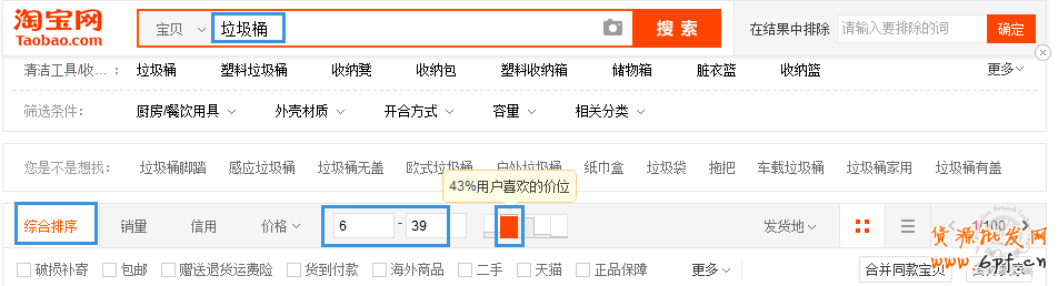 對于寶貝的價格可以從淘寶搜索寶貝的中心詞進行查看,例如搜索“垃圾桶”。