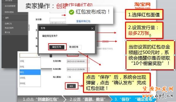 店鋪紅包的面額有10元、20元、50元、100元和200元五種可選。單個(gè)賣家同時(shí)只能生成1種店鋪
