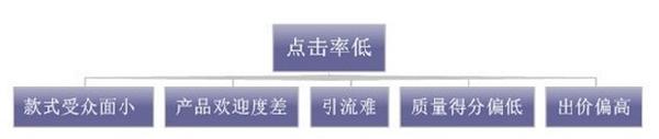 一般來(lái)說(shuō),在直通車推廣中,車能否順利開起來(lái),點(diǎn)擊率是最核心的問題,它不僅是影響質(zhì)量得分的核心因素,也是打造爆款引流的先決條件,凡是爆款寶貝,點(diǎn)擊率都不會(huì)太低。而點(diǎn)擊率很低的寶貝,也很難成為爆款,若堅(jiān)持要推廣此寶貝的話,耗費(fèi)的代價(jià)和成本絕對(duì)很高。所以點(diǎn)擊率決定直通車的成敗,決定爆款的走向。而點(diǎn)擊率低的原因是什么?會(huì)有什么樣的后果?我們可以看一下以下這兩張思維導(dǎo)圖。