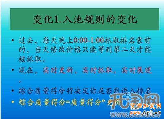 變化1:最大的是由定點定時抓取到實時更新的改變,這個對我們來說還是比較人性化一點的。我們不用在三更半夜守在直通車調定向的出價了。新規則改過來后,我們就可以實時的去調整,根據我們的平衡點去做定向推廣。不像之前那樣為了入池可能會把價格往上提。當然入池的本質還是沒有改變,最終還是要通過綜合得分來決定。