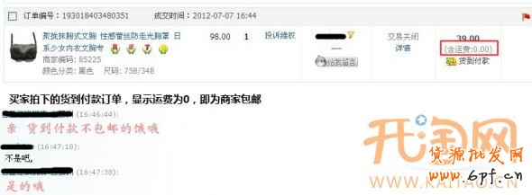 買家拍下貨到付款訂單,運費顯示為零,即商家包郵。