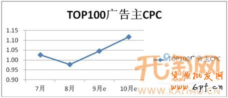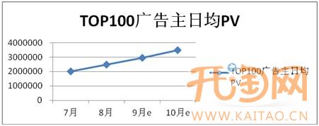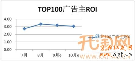 以9月份日均消耗TOP100商家作為研究樣本(占廣告主的1.6%,消耗的近40%)。通過對(duì)7~10月PV、ROI、CTR、CPC、CPM出價(jià)、消耗等的對(duì)比,TOP100廣告主日均需求PV每月平均呈20%的速度增長(zhǎng),日均消耗每月呈27%的速度增長(zhǎng)。