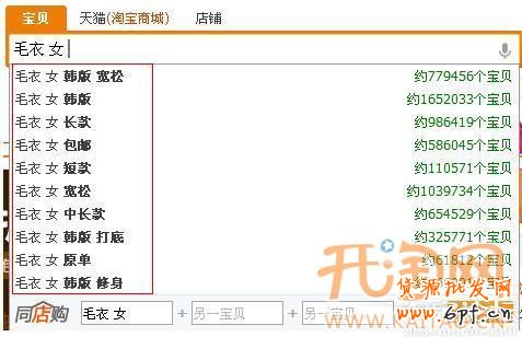 例如我們搜索我們產(chǎn)品詞 “毛衣 女” 下拉有韓版 寬松 包郵 長款 中長款 打底 原單 修身。。。并且后面有各關鍵詞大約有多少寶貝數(shù)量,根據(jù)寶貝本身有事添加相對競爭優(yōu)勢的關鍵詞。這些詞都是經(jīng)常被買家搜索的。