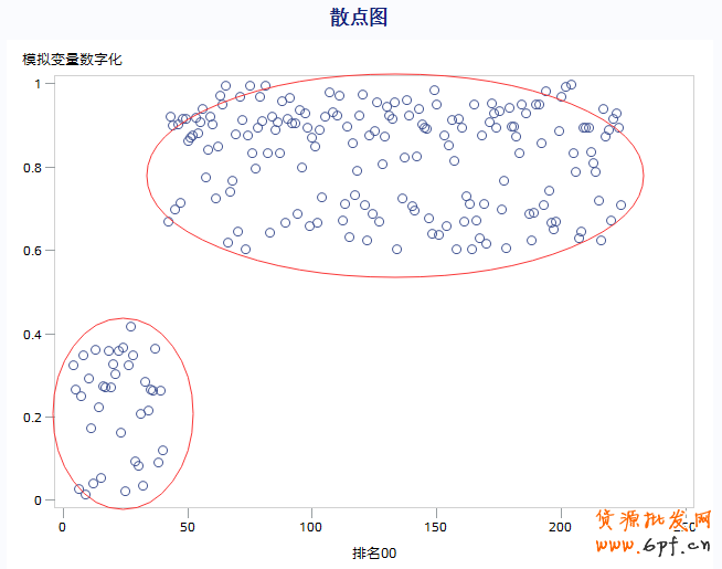 這個就是我剛剛弄好的兩個變量,其中假設排名分,就是設的一個根據排名越高,給分越高的一個設定,在這個分析中,并沒有什么作用,大家不必去在意。然 后,需要做一個初步判斷,最簡單的方法,就是作圖,直觀,簡單,能看出很多東西。我先做了一個散點圖,看看分布。