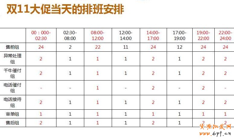 咨詢量從10號的下午18:00開始上升,22:00至11號凌晨到達(dá)高峰,故排版應(yīng)該安排盡可能多人手在高峰時(shí)段,其他時(shí)間實(shí)行分班休息,保留體力精神保證服務(wù)質(zhì)量。
