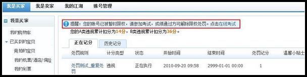 會(huì)員由于違反淘寶網(wǎng)用戶行為管理規(guī)則受到處罰,處罰期間屆滿后,會(huì)員需參加線上考試并且獲得合格,相關(guān)的處罰措施才能被解除。
