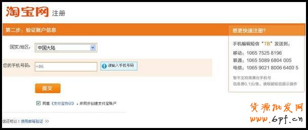 填寫手機號碼,必須是未被注冊使用的手機號。 進入該頁面,說明之前提交的注冊信息已成功,此時您已有了一個未激活的淘寶賬戶,需要輸入手機收到的校驗碼進行激活(若查收不到校驗碼請點此查看),若您不小心把該頁面關閉了,不用著急,進入登錄頁面輸入賬戶名和密碼,點擊“登錄”該頁面又會出現。
