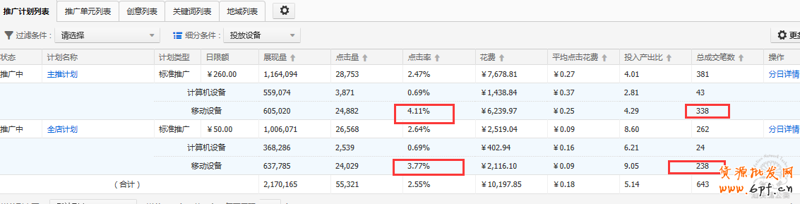 除了重點對關鍵詞進行調整外,這三大流量入口不容忽視,定期做好數據分析和反饋,在日限額可以接受的范圍內適當加大測試后點擊轉化高的,站外和定向的ppc雖然低,但是成交筆數不是很高,適當調整下占比;最為凸顯的是店鋪的無線端這一塊效果很不錯,高點擊率高產出,成交筆數遠遠超過pc端的,主力還是側重在無線端這里。