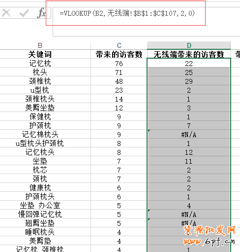 這樣之后,就能很清楚的看清PC端和無線端的一個(gè)用詞區(qū)別。這里的顯示的#N/A的意思就是,在無線端那邊沒有找到相應(yīng)的詞,可以理解為這個(gè)詞在無線端沒有給我們帶來流量。