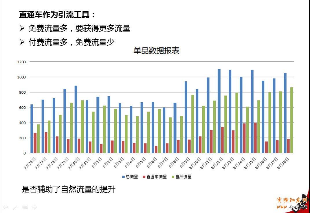 圖中藍(lán)色代表花費(fèi)直通車(chē)流量,綠色的自然流量,剛開(kāi)始直通車(chē)流量占總流量40%多。后期穩(wěn)定期,直通車(chē)付費(fèi)流量逐漸減少,縮減為只占20%,只要是用自然流量獲取轉(zhuǎn)化也可以達(dá)到不錯(cuò)的效果。所以在操作直通車(chē)的時(shí)候,主要的關(guān)注點(diǎn)是直通車(chē)是不是在輔助自然流量提升,這才是意義所在。