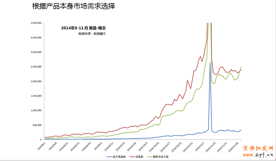 這里使用的工具是數(shù)據(jù)魔方,數(shù)據(jù)以2014年8月-11月男裝棉衣二級(jí)類目下整體數(shù)據(jù)為例,不過(guò)為了讓生意參謀作為商家統(tǒng)一的數(shù)據(jù)平臺(tái),數(shù)據(jù)魔方將會(huì)在12月月底下線。它現(xiàn)在調(diào)整到了生意參謀的市場(chǎng)行情的專業(yè)版。