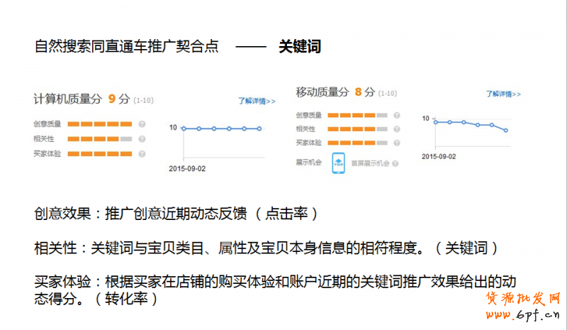 而關(guān)鍵詞的質(zhì)量得分,大概分成三個(gè)方面,這三者是息息相關(guān)的。在點(diǎn)擊率方面需要細(xì)分,有歷史點(diǎn)擊率和實(shí)時(shí)點(diǎn)擊率,一般直通車(chē)開(kāi)了比較久,歷史數(shù)據(jù)不會(huì)太差,平均點(diǎn)擊花費(fèi)也會(huì)降低,做好直通車(chē)不是太難,只要做好產(chǎn)品和服務(wù),一天上首頁(yè),幾天內(nèi)讓質(zhì)量得分上十分都不是難事,但是要看能不能保持。