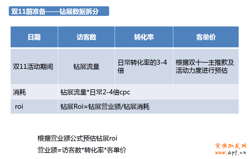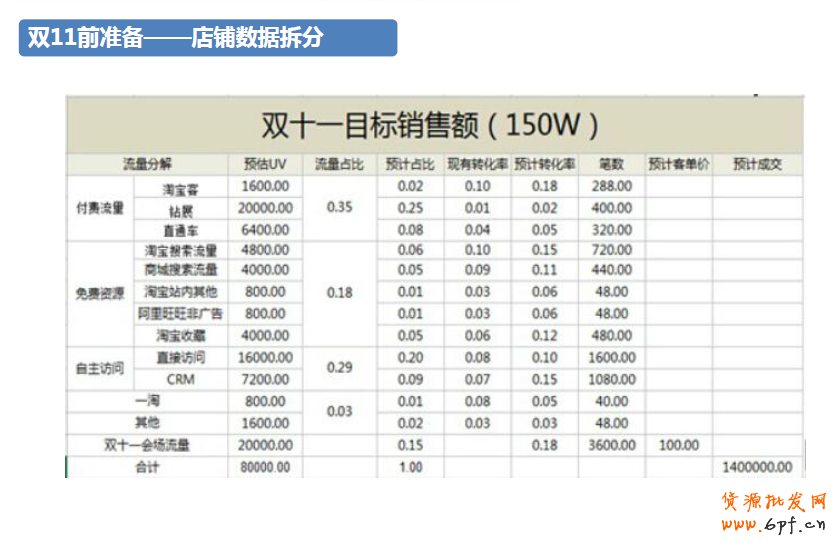 首先要進行數(shù)據(jù)的拆分,大家可以看到,店鋪的流量一部分來自付費流量,一部分來自免費流量。這個店鋪的雙11目標是150萬,細分到每個渠道需要多少UV,轉化率是多少,就是我們做規(guī)劃的目的。要先設定好目的才可以進行投放的規(guī)劃。根據(jù)以往的經驗,我們做了鉆展轉化率的評估,雙11的轉化率可以達到平常的3~4倍。